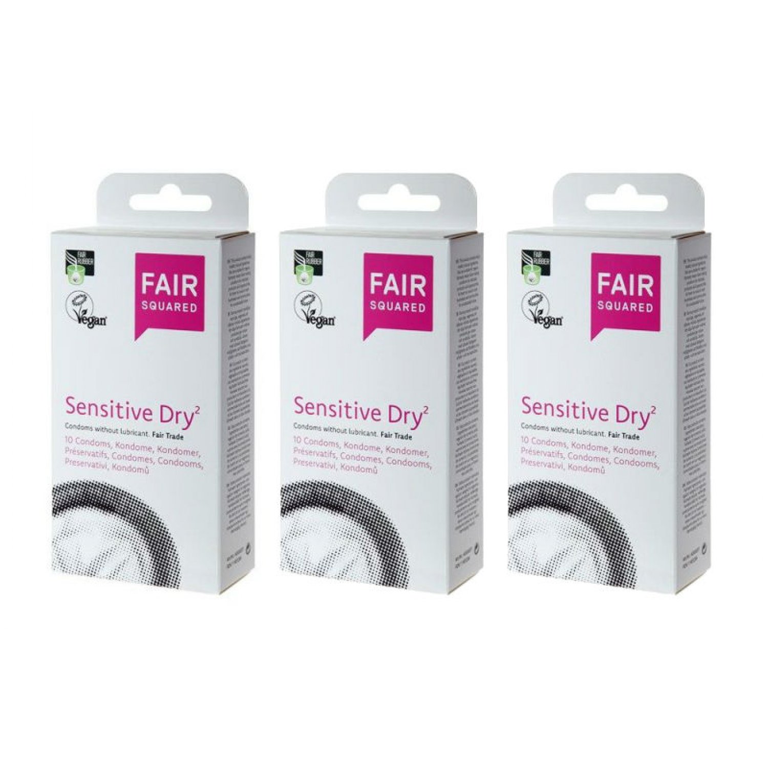 30 stuks verpakking fair Squared Sensitive Dry condooms. Het Fair Squared Sensitive Dry condoom is het enige condoom in ons assortiment wat niet is voorzien van glijmiddel. Bepaal zelf of je glijmiddel wilt gebruiken en welk soort glijmiddel. Het Fair Squared Sensitive Dry conoom is een duurzaam condoom van natuurlijk latex en is CO2 neutraal geproduceerd. Het rubber komt uit plantages in India waarna het vervolgens wordt verwerkt in Duisland. Deze Fair Trade condooms zorgen voor betere leef- en werkomstandigheden voor de arbeiders in India omdat ze worden betaald voor de werkelijke productiekosten en deze prijs niet wordt bepaald door de internationale markt. Kenmerkend van Fair Trade producten is dat er strengere milieuseisen en handelsvoorwaarden aan deze producten worden gesteld.