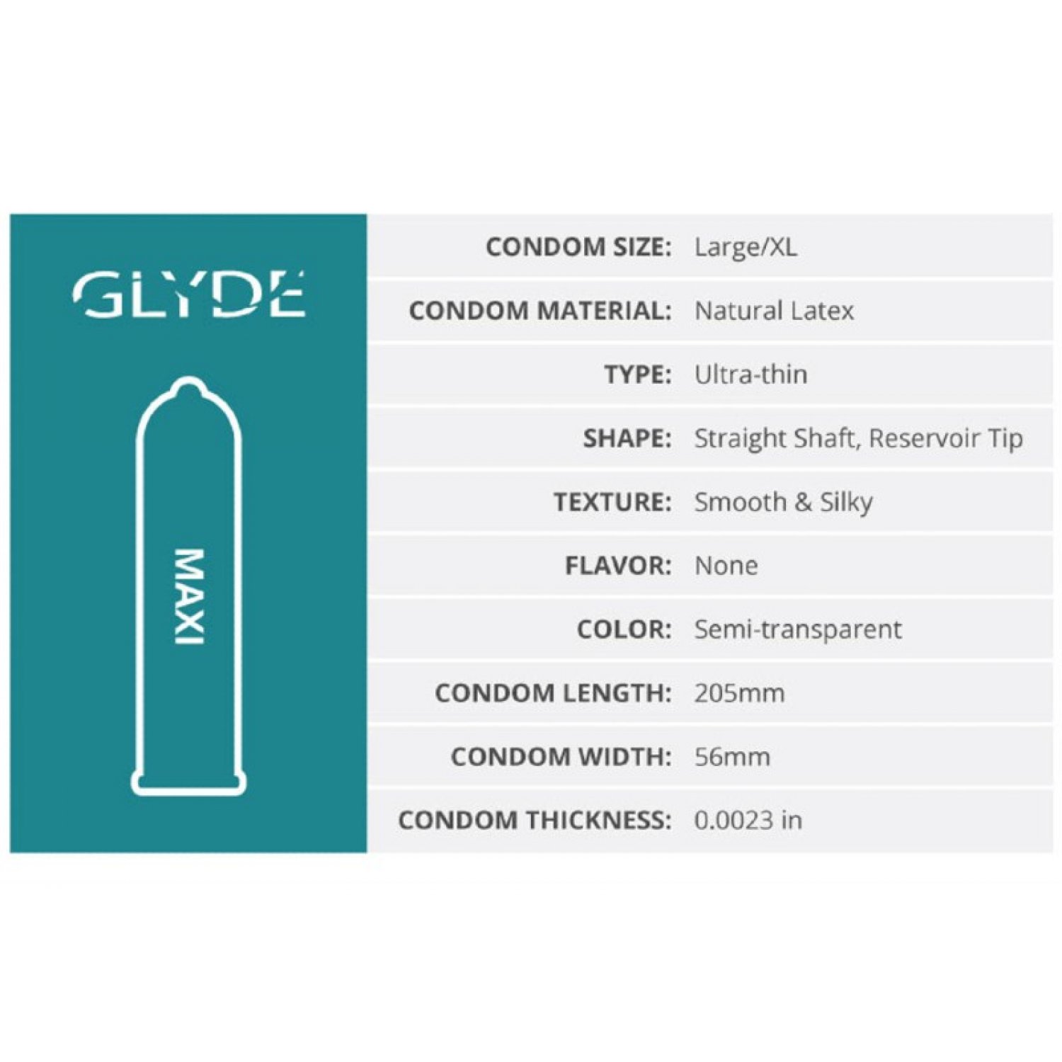 Het Glyde Ultra Natural Maxi condoom is een duurzaam xl condoom van biologisch fair-trade rubberlatex en is bovendien vegan-proof. Het condoom is recht van pasvorm en voorzien van glijmiddel, ook is het condoom smaak- en geurloos en transparant van kleur. Glyde condooms zijn veganistisch wat betekent dat er geen dierlijke producten of stoffen in zijn verwerkt. In normale condooms wordt het dierlijke melkeiwit caseïne verwerkt. Glyde gebruikt hiervoor een bepaald distelextract dat eenzelfde werking heeft.